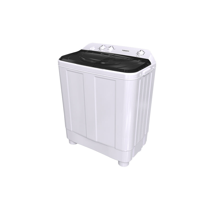 The TORNADO Half-Automatic Washing Machine offers a 7kg capacity with a 1200 RPM max spin speed. Featuring a stylish transparent black top cover, it comes with two tubs (washing and drying), two motors, and a waterproof control panel. It supports all types of detergent and offers two wash programs (Standard and Strong) for efficient cleaning.
