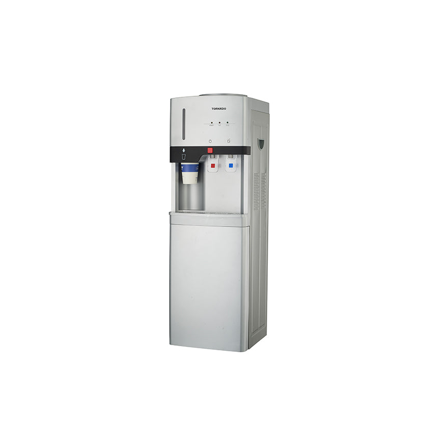Enjoy convenience with the TORNADO Top Loading Water Dispenser, offering hot, cold, and normal water options. It features a child safety lock for the hot water tap, automatic thermostat technology, and over-current protection. With efficient heating (5L/h) and cooling (2L/h) capacities, it ensures fresh water anytime. Equipped with an R134a compressor for reliable performance.